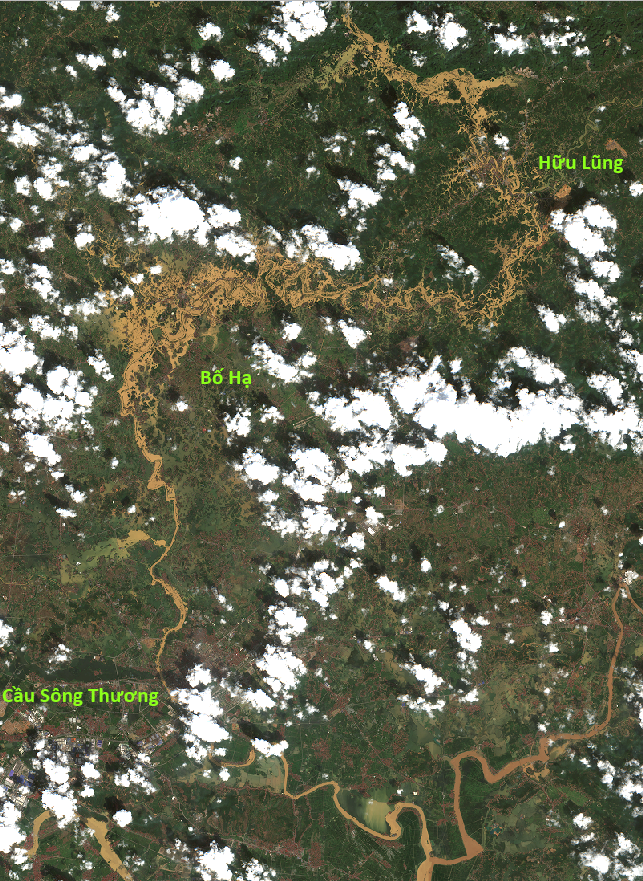 Bão số 11 và mưa lũ sau bão đã gây ngập lụt nghiêm trọng từ ngày 7/10, gây ngập lụt nghiêm trọng tại nhiều địa phương, bao gồm các địa phương dọc sông Cầu và sông Thương. Từ ngày 9/10, lũ đã giảm tại một số địa phương, diện tích khu vực bị ngập lụt cũng dần thu hẹp tại khu vực lưu vực sông Cầu (https://vegacosmos.com/dien-bien-ngap-lut-khu-vuc-song-cau-doan-qua-bac-ninh-do-hoan-luu-bao-matmo-nhin-tu-anh-ve-tinh). Tại lưu vực sông Thương, thông tin ghi nhận được trên ảnh vệ tinh Sentinel-2 chụp khu vực này lúc 10:26’ ngày 9/10 và 10:32’ ngày 11/10/2025, cho thấy diễn biến ngập lụt có tín hiệu khả quan.