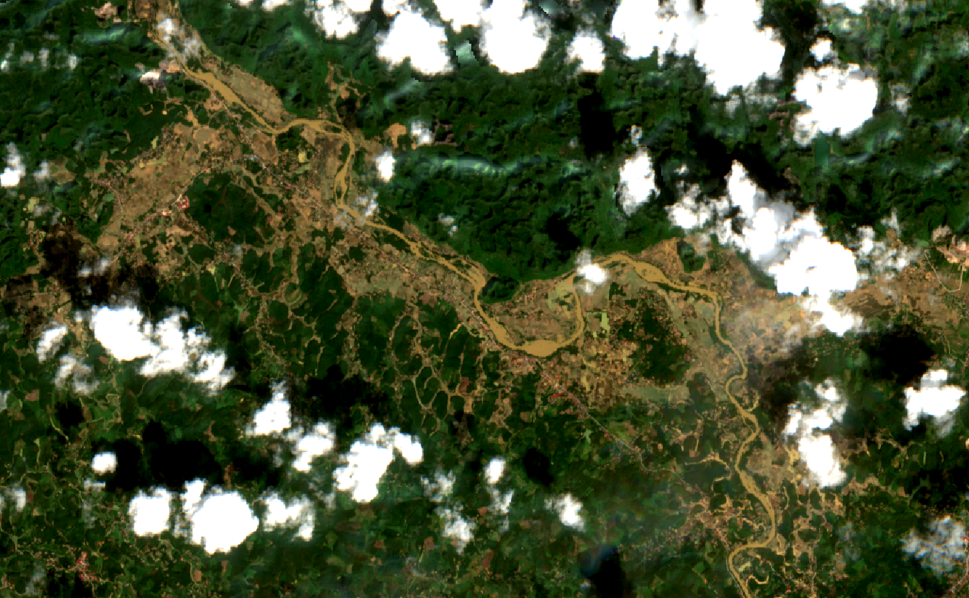 Toàn cảnh lưu vực sông Thương trên ảnh Sentinel-2 lúc (1a) 10:26 sáng ngày 09/10/2025 và (1b) 10:32 sáng ngày 11/10/2025